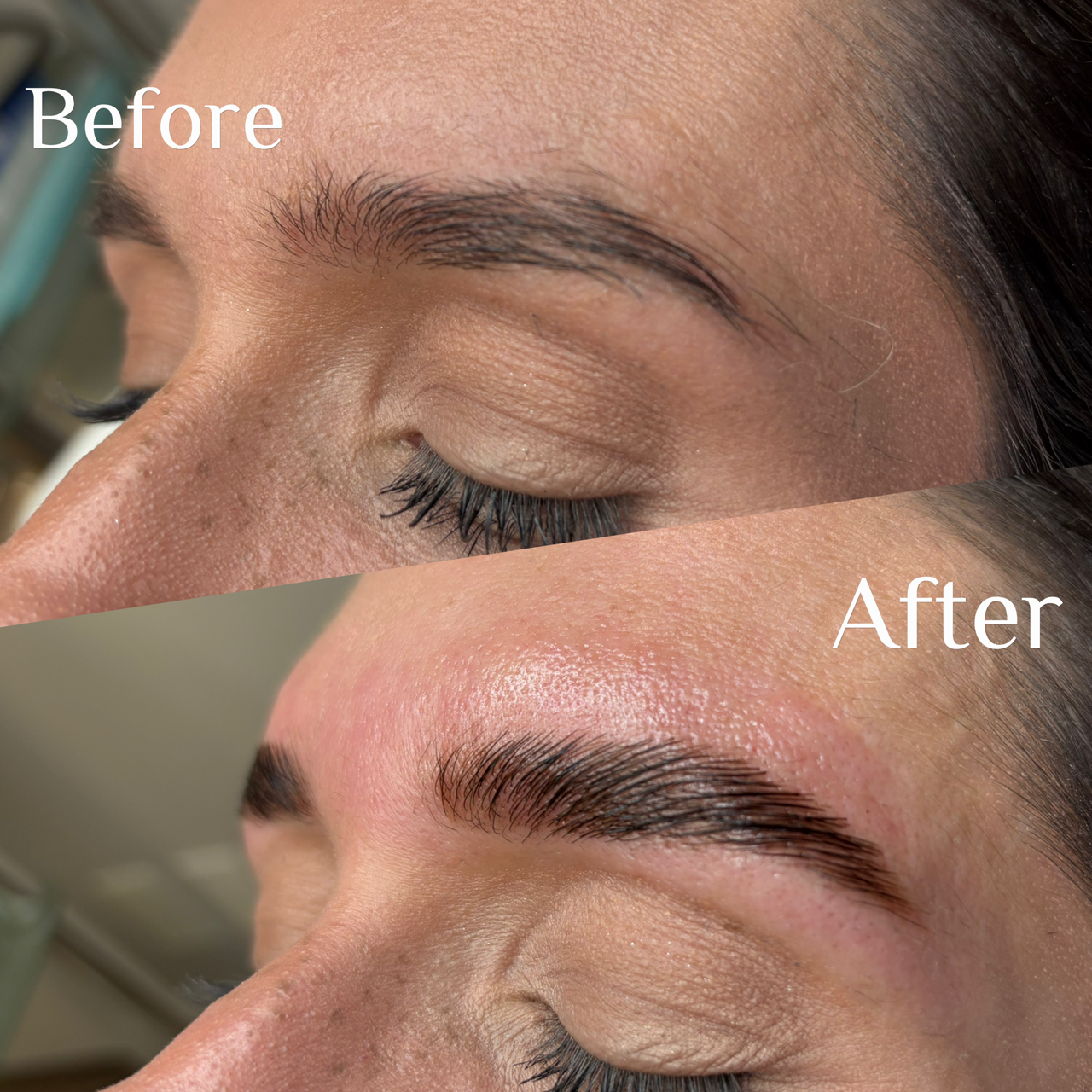 Expect mild redness and light flaking as your brows heal over 7–10 days. The pigment will soften and settle into a beautiful, natural tone.